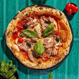 Thon en morceaux dans une pâte napolitaine cuite au feu de bois avec frites crinkles, garniture et suppléments au choix.
