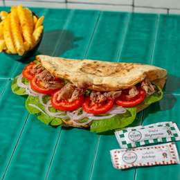 Viande de bœuf en kabeb dans une pâte napolitaine cuite au feu de bois avec crinkles, garniture et suppléments au choix.