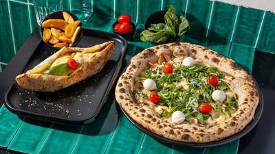 Poulet panée maison dans une pâte napolitaine cuite au feu de bois avec crinkles, garniture et suppléments au choix.