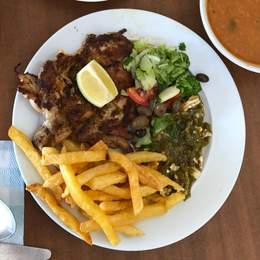 Harissa, salade mechouia, laitue, oignon, tomate, frites
