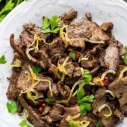 Foie volaille sauté avec oignons et persil avec salades vertes et mechwia et frites