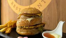 Un burger avec 200 g de poulet haché, double fromage, sauce maison, laitue, tomate et oignons caramélisés, une version généreuse et savoureuse