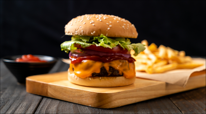Un burger composé de 100 g de steak haché, double fromage, sauce maison, laitue, tomate et oignons caramélisés, le tout relevé avec une sauce fromagère