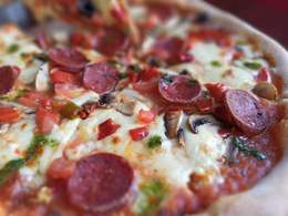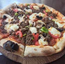 Sauce tomate, mozzarella, champignons, tomates fraiches, oignons, viande de bœuf hachée