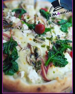 Sauce blanche, mozzarella, cheddar, ricotta, poulet, champignons, épinards