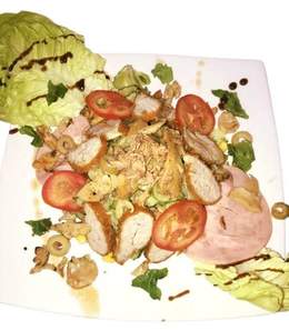 Coeur de Laitue, Tomate, Fromage fondue, Champignons sautés, poulet fumé,Croûtons, Noix