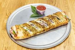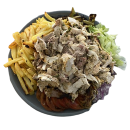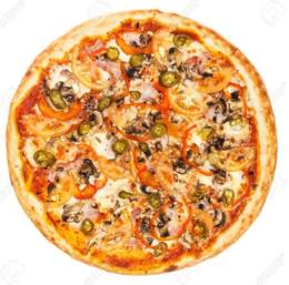 Sauce tomate, double pâtes, mozzarella, poulet, jambon de dinde, champignons, légumes, olives