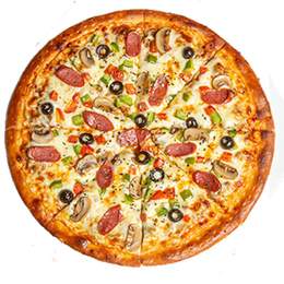 Sauce tomate, mozzarella, champignons, légumes jambon de dinde, thon