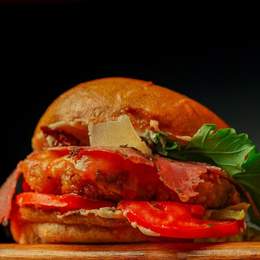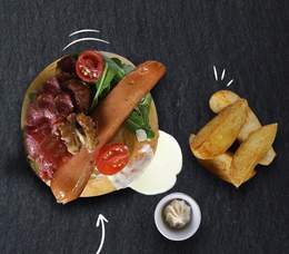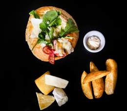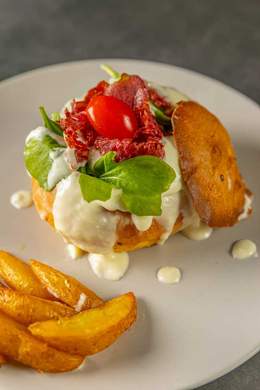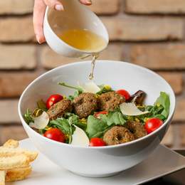 Mélange de salades, légumes confits, tomates, bresaola mozzarella marinée à l'huile de basilic, grana padano, amandes effilées,tomate séchée,vinaigrette au basilic
