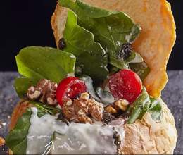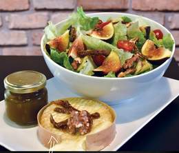 Mélange de salades, légumes confits, tomates, abricots séchés, figues séchées, noix, camembert rôti au miel, vinaigrette miel et moutarde