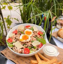 Mélange de salades, légumes confits, tomates, blanc de poulet grillé, œuf mollet grana padano, vinaigrette césar