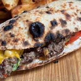 Sauce fromage, oignons caramélisés, tomate, viande hachée, mozzarella