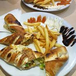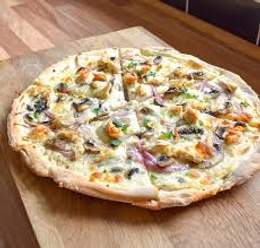 Sauce fromage, oignons caramélisés, tomate, poulet, champignons, mozzarella