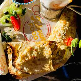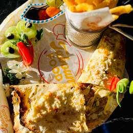 Un goût oriental revisité : viande de chawarma bien assaisonnée, frites, sauce fromagère faite maison au lait naturel, et les sauces que vous aimez. Une explosion de saveurs simples et bonnes.