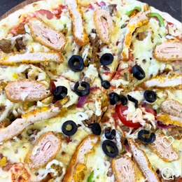 "Pizza 4 Saisons Gourmande avec escalope tendre, crispy croquant, pepperoni savoureux et légumes sautés frais. Une combinaison parfaite de saveurs sur une pâte fine, pour une expérience gustative unique et délicieuse !"