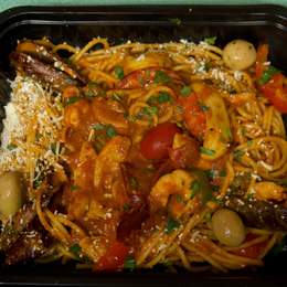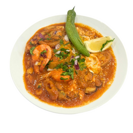 Sauce tomate, tomate, piment, oignon, gousses d'ails, persil, œuf, chevrettes, moules, calamars