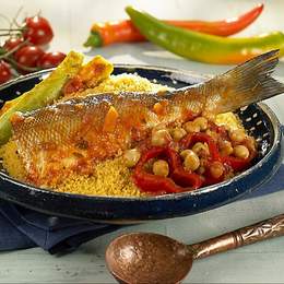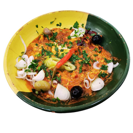 Riz ou tastira ou pâtes sauce rouge ou ojja, harissa, mayonnaise, salade tunisienne, frite, rougets grillés (3 pièces)