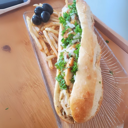 Une baguette moins quart, sauces au choix, salades, escalope grillé, fromage slice, oeuf, frites