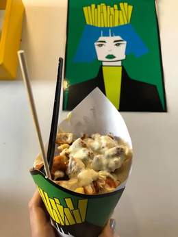Frite, sauce cheddar, poulet, viande hachée, sauce au choix