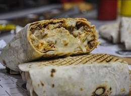 Frites à l'intérieur, sauce fromagère, deux sauces au choix, laitue, tomate, mais, oeuf