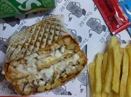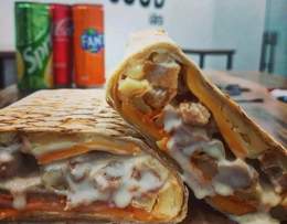 Frites à l'intérieur, sauce fromagère,Escalope grillée, chevrette, sauce à l'ail, sauce algérienne, cheddar, oeuf, frites servi avec un boisson Coca Cola