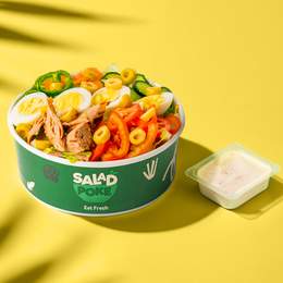 Thon, 2 oeufs durs, olives vertes, concombre, carottes, laitue, tomates, oignons, poivrons verts + 1 sauce au choix. Ajoutez un Energy Booster (chia, sésame, graines, raisins secs, noix) +2.50DT