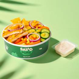 Escalope de poulet panée, concombre, carottes, laitue, tomates, oignons, maïs, fromage, tortilla chips + 1 sauce au choix. Ajoutez un Energy Booster (chia, sésame, graines, raisins secs, noix) +2.50DT
