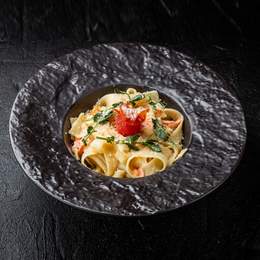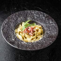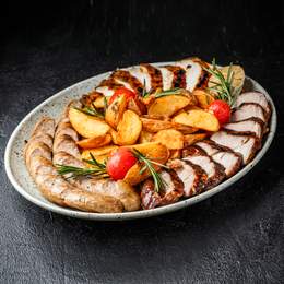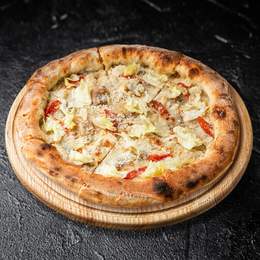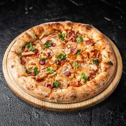 Філе куряче sous-vide, шинка, мисливські ковбаски, пепероні, сир Моцарела, печериці, петрушка, цибуля ріпчаста, соус BBQ та трюфельна олія