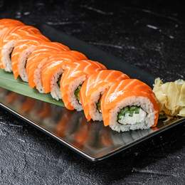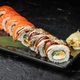 Рол з лососем, сиром філадельфія та огірком, рол філадельфія з лососем і вугром, рол з креветкою, сиром філадельфія, огірком та соусом чилі, рол з вугром, сиром філадельфія, огірком та соусом унагі в кунжуті, рол з сиром філадельфія, огірком, соусом