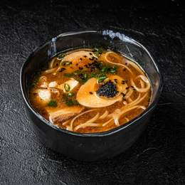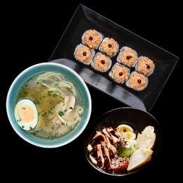 Перша страва: Курячий бульйон - курячий бульйон, курка, локшина, яйце, петрушка (300г); Друга страва: Фелікс рол з вугром, сурімі-кімчі, огірком, сиром Філадельфія (240/40г); Салат: Цезар з куркою - куряча грудка гриль, мікс салатів, томати, сир пармезан