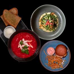 Перша страва: Борщ«Украінський» з курячим філе sous-vide. Подається зі сметаною, чорнім хлібом та часниковим соусом (280/20/50г); Друга страва: Beef burger - бургер з котлетою із яловичини, картопля фрі, пікантний соус (195/75/30г ); Салат: Кайсо - чука,