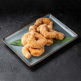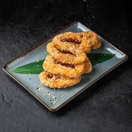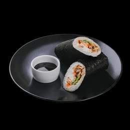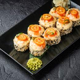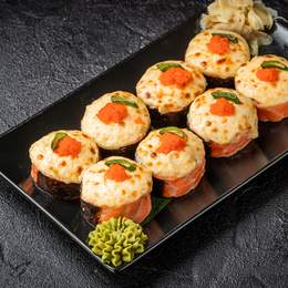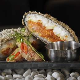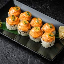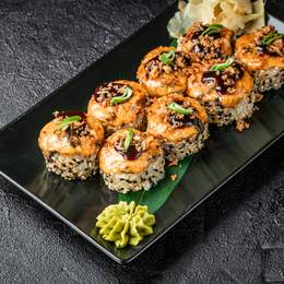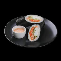 Суші-бургер з лососем, авокадо, вершковим сиром, тобіко, листям салату, цибилею шалот, соусом шрірачі. Подається з соусом унагі та перцем чилі панко