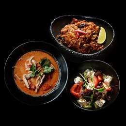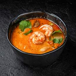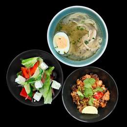 Перша страва: Том Ям з куркою - класичний тайський суп на кокосовому молоці з грибами, куркою, томатами, кінзою (300г); Друга страва: Cкляна локшина з куркою (210/15); Салат: Грецький - томати, огірки, солодкий перець, сир фета, солодка цибуля, маслини,