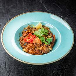 Перша страва: Курячий бульйон - курячий бульйон, курка, локшина, яйце, петрушка (300г); Друга страва: Cкляна локшина з куркою (210/15); Салат: Грецький - томати, огірки, солодкий перець, сир фета, солодка цибуля, маслини, айзберг, оливкова олія, орегано