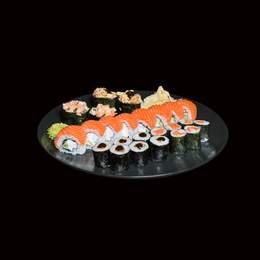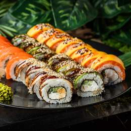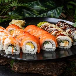Рол з лососем, креветкою, сиром філадельфія, сиром чеддер, огірком кунжутом та соусом чилі, рол з авокадо, огірком та сиром філадельфія, рол з лососем, вугрем, сиром філадельфія і огірком