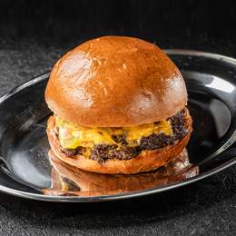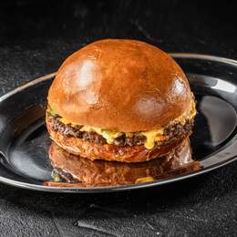 Здобна булочка, дві котлети з яловичини,сир Чеддер, маринований огірок, карамелізована цибуля, сирний соус та соус з перцем Халапеньо
