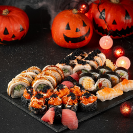 Норі,рис,сир філадельфія,сир чедер,лосось, креветка тигрова,ікра,айсберг,авокадо,соус спайсі,манго соус,соус унагі,чорнило каракатиці 390 грам