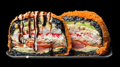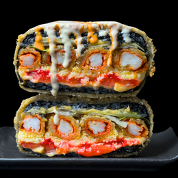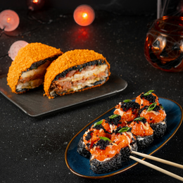 Норі,рис,сир чедер,мікс сирів,креветка тигрова панко,помідор,капуста айсберг,соус спайсі,сирний соус,чорнило каракатиці 390 грам