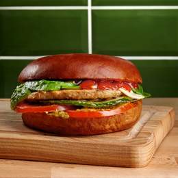 Захотілося чогось легенького?Не хочеться м'яса або дотримуєтесь дієти? Це не привід відмовляти собі у смачному бургері. Для вас ми зробили вибуховий мікс зі свіжих та обсмажених овочів, соусу песто, горіхового соусу та двох видів сиру - брі та чеддер