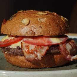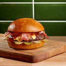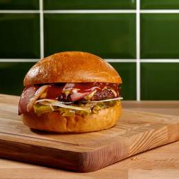 Всім, хто любить насичений смак м'яса з легким присмаком димку присвячується наш бургер Барбекю. Соковита яловича котлета, американський бекон, ароматний чеддер, хрусткий солений огірок, маринована цибулька та соус барбекю