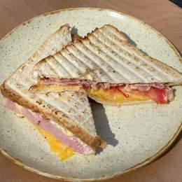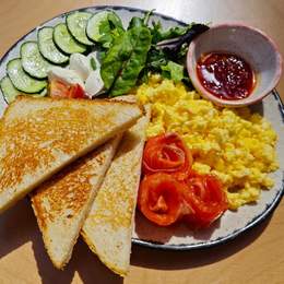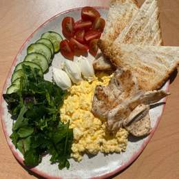 Смажене куряче філе, скрамбл з 2х яєць, мікс овочів, крем-сир, тостовий хліб, конфітюр з солодкого та гострого перців