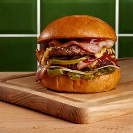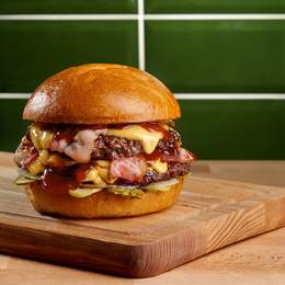 Багато м'яса не буває. Це девіз нашого Дабл барбекю.Дві котлети та ще більше бекону, смак яких підкреслює сир чеддер, оптимально промариновані огірок і цибуля. Духмяна крафтова картопляна булочка - це ідеальна основа, що зберігає всі смаки та аромати