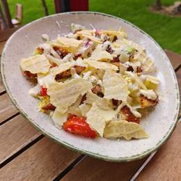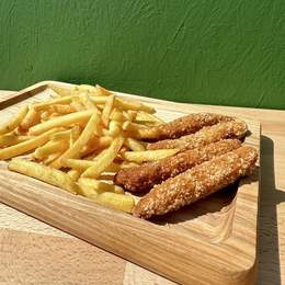 Рибні стріпси власного виробництва, багато овочів, сир у поєднанні з нашим тартаром та часниковим соусом