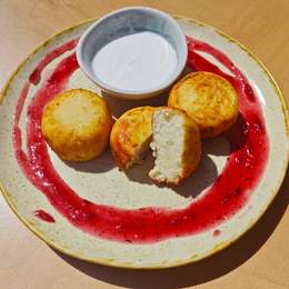 3 сирничка. Подаємо зі сметаною та кисло-солодким брусничним соусом
