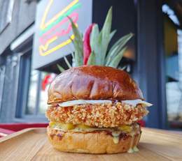 Тропічний бургер зі свіжим карамелізованим ананасом, курячою котлетою у паніровці, соусом солодкий-чілі та ще декількома секретними інгредієнтами