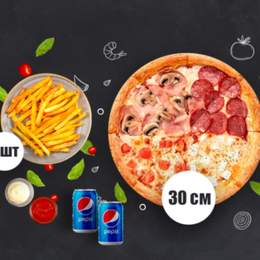 Піца 30см на вибір- 1 піца.Соус для бортиків - у подарунок до кожної піци Картопля на вибір (фрі, картопляні діпи, картопля по-селянськи)- 2 порц. (2х150г) Соус на вибір- 2 шт. (2х24г) Пепсі 330мл- 2 баночки