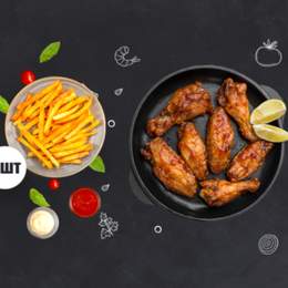 Курячі крильця на вибір- 1 порц. Картопля на вибір (фрі, картопляні діпи, картопля по-селянськи)- 2 порц. (2х150г) Соус на вибір- 2 шт. (2х24г)