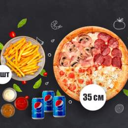 Піца 35см на вибір- 1 піца. Соус для бортиків - у подарунок до кожної піци Картопля на вибір (фрі, картопляні діпи, картопля по-селянськи)- 3 порц. (3х150г) Соус на вибір- 3 шт. (3х24г) Пепсі 330мл- 3 баночки