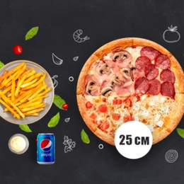 Піца 25см на вибір- 1 піца. Соус для бортиків - у подарунок до кожної піци Картопля на вибір (фрі, картопляні діпи, картопля по-селянськи)- 1 порц. (150г) Соус на вибір- 1 шт. (24г) Пепсі 330мл- 1 баночка
