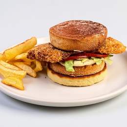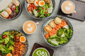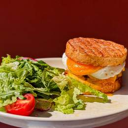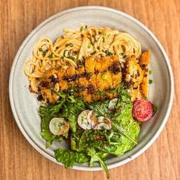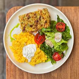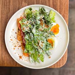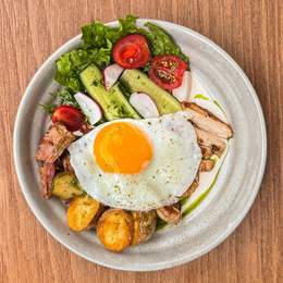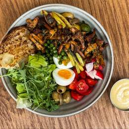 молода картопля, брюсельська капуста, стручкова фасоля, зелений горошок, варене яйце, смажені оливки, мікс салату, свіжі чері та редиска. подаємо з подовим хлібом та соусом анчоус-вінігрет.